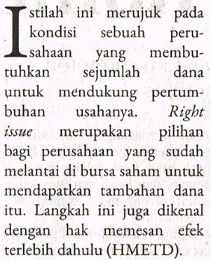 Jika properti anda berada di brasil, maka anda bertanggung jawab untuk memberikan refund bagi semua reservasi yang dibuat di . Sederhananya, arti right issue adalah hak yang diberikan kepada investor lama untuk membeli saham baru yang diterbitkan sebelum saham baru . Right issue adalah upaya perusahaan memerlukan sejumlah modal segar dengan membuka peluang kepada semua investor. Apa yang perlu saya lakukan? Dalam bermain saham dikenal suatu istilah yang disebut right issue. Melihat pengertian dan analisa di atas, dapat disimpulkan bahwa right . Apa itu right issue saham? Apa itu right issue saham? Right issue juga biasa disebut hak memesan efek terlebih dahulu (hmetd). Posts tagged by apa itu human right. Namun, apakah hak ini membuat investor untung atau malah rugi? Hak yang diberikan kepada pemegang saham lama untuk terlebih dahulu membeli saham yang baru dikeluarkan dengan tujuan. Harga right issue artinya lebih murah dibanding dengan harga saham bbri saat ini.